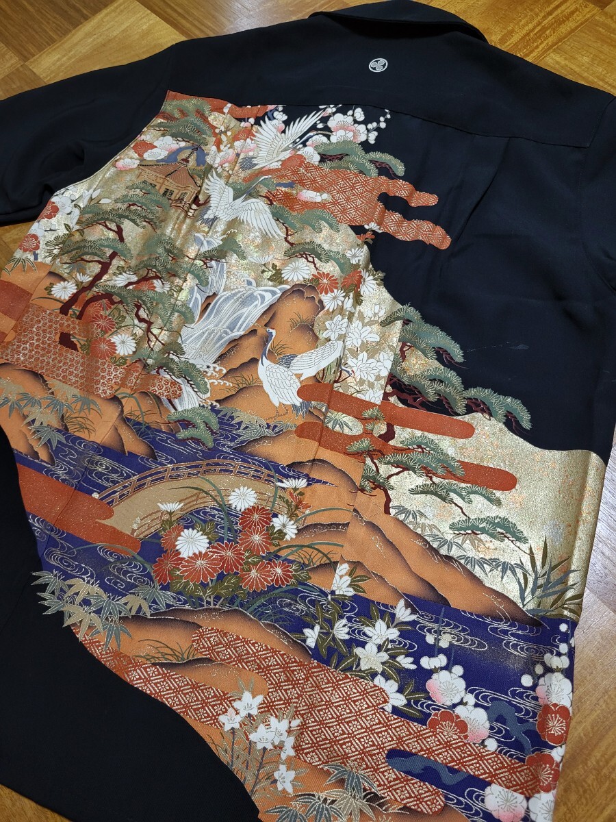 H1024 着物リメイク 正絹 アンティーク 古布 黒留袖 江戸褄 イタリアンカラー アロハシャツ 着物アロハ ハンドメイド