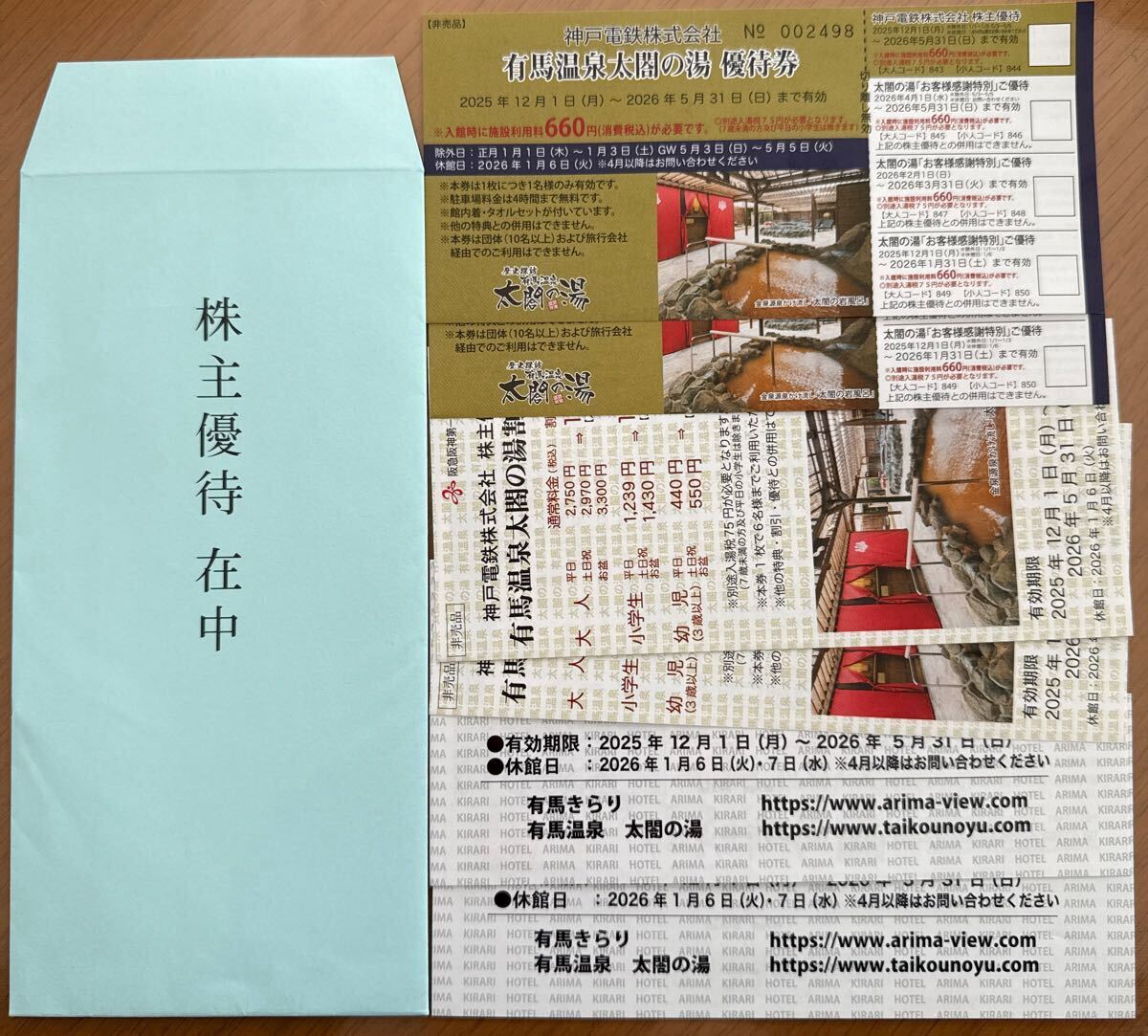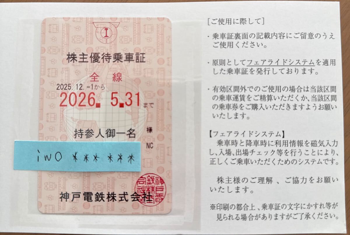 神戸電鉄 株主優待乗車証(全線定期券)裏面 黒色 NC 2025.12.1から 2026.5.31まで有効。太閤の湯と有馬きらり優待券、割引券付き