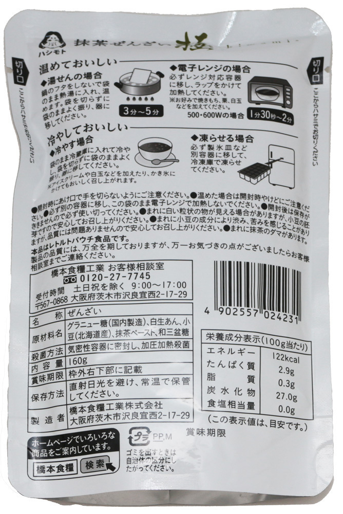 抹茶ぜんざい 160g×4袋 宇治抹茶使用 あんひとすじ (メール便)善哉 お汁粉 橋本食糧 スタンドパック お手軽 国産 国内産 レトルト