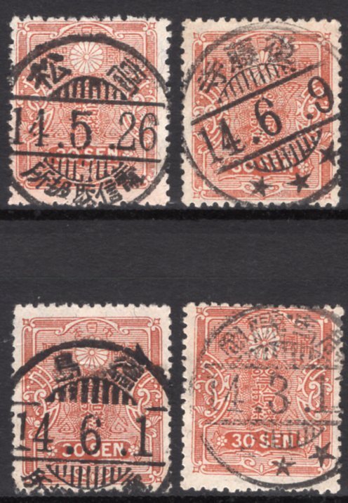 田沢切手 旧大正毛紙30銭 櫛型印ほぼ満月消し4枚 大正14年使用、C欄:電信取扱所: 高松局 徳島局, C欄:★★★: 後藤寺局, 群馬・藤岡局,