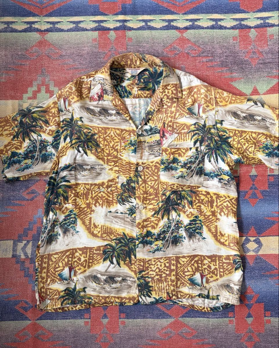 【SALE品】60s sports wear rayon aloha shirt アロハシャツ 半袖 総柄 ハワイアンシャツ レーヨン 開襟 アロハ 50s ハワイ製
