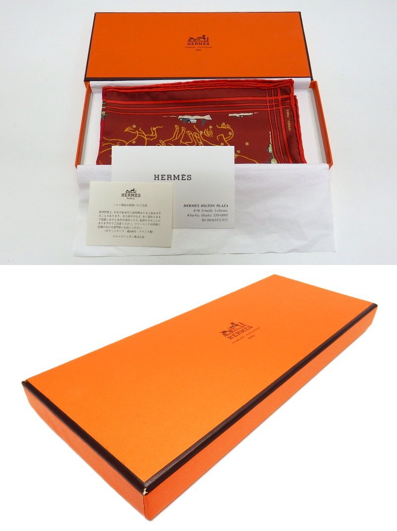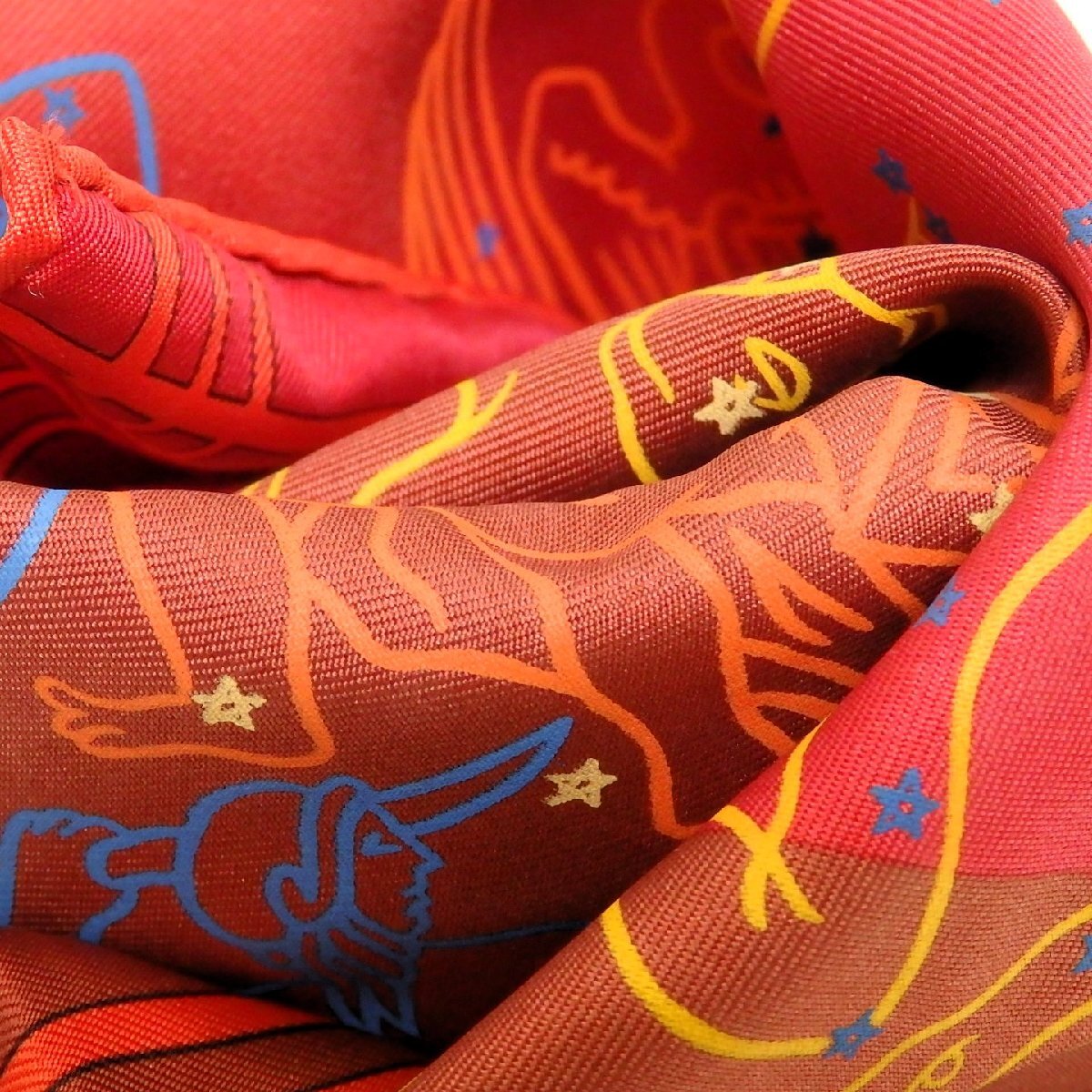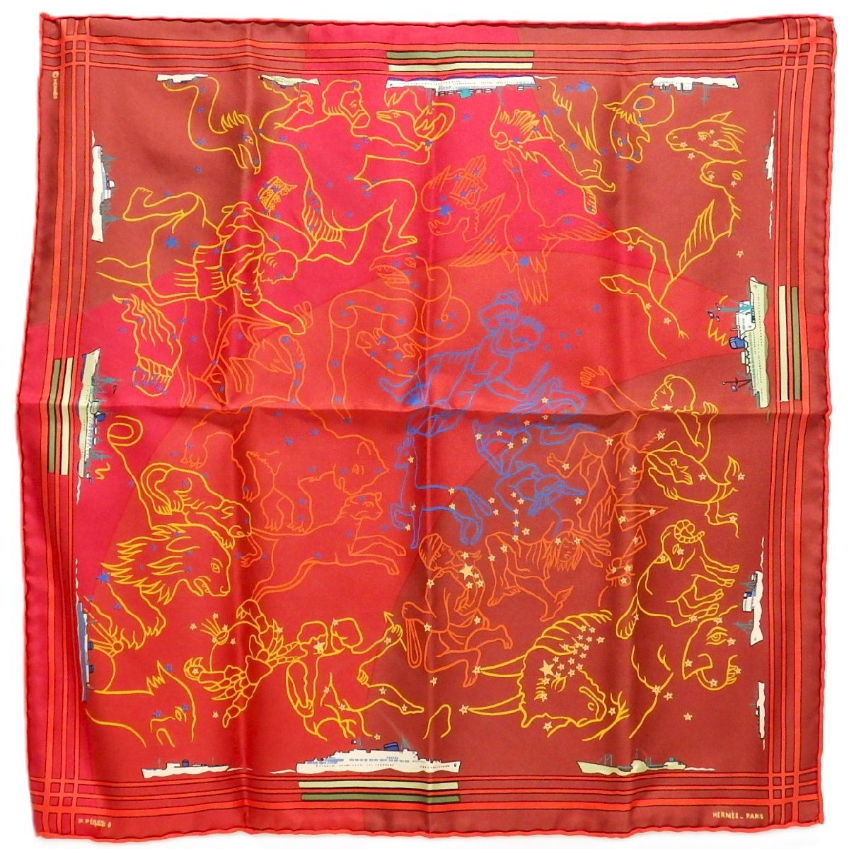 激レア 美品 HERMES エルメス カレ40 星座柄 ミニスカーフ レッド系 保存箱付き [7] プチカレ SILK100% CARRE40 ポケットチーフ ○