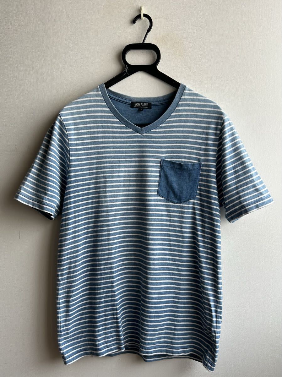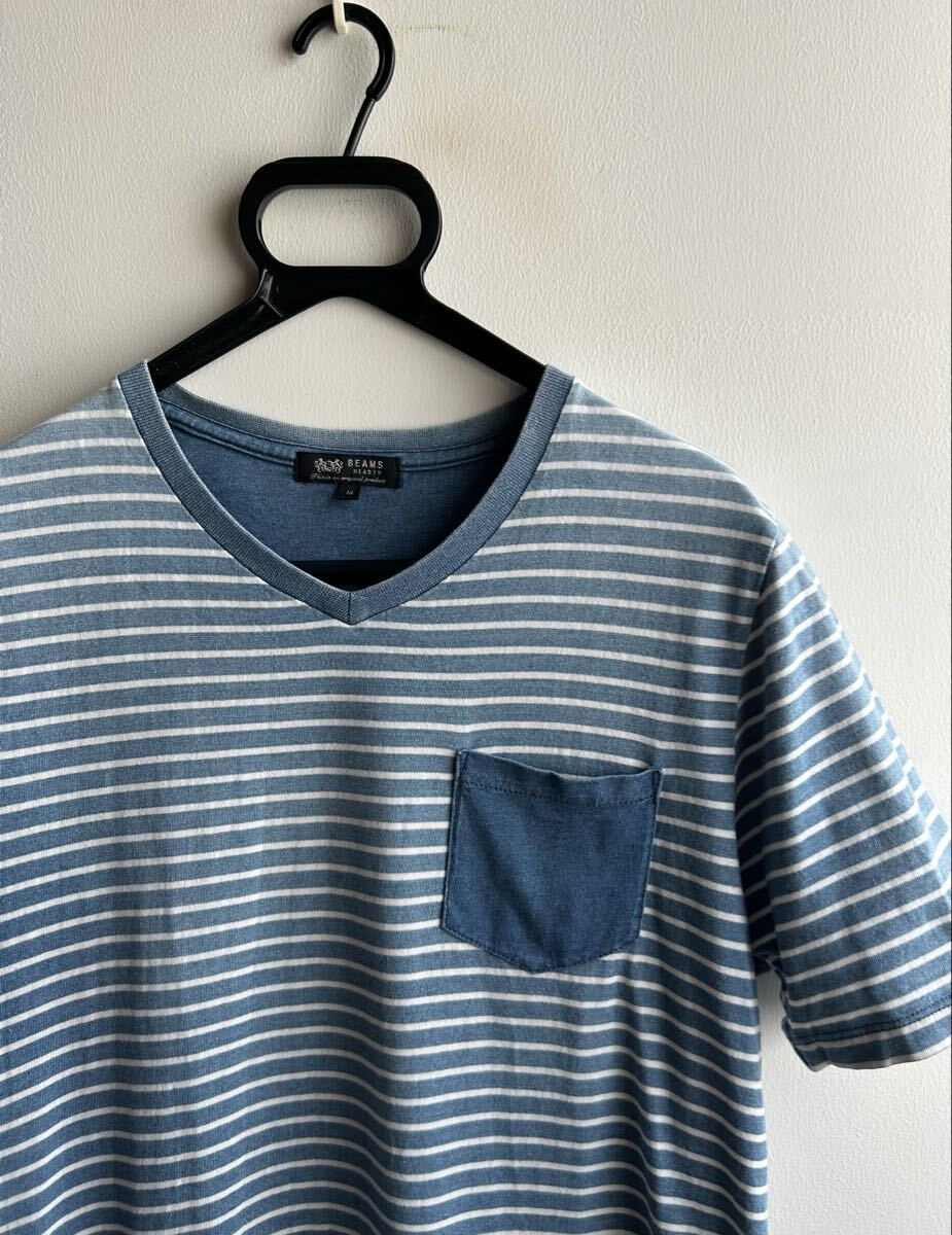 【美品】BEAMS HEART カットソー Tシャツ メンズ M ボーダー インディゴ 紺 Vネック ビームス ハート