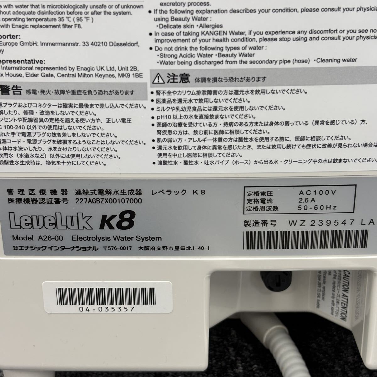 ♪ Enagic LeveLuk K8 A26-00 KANGEN WATER 通電確認済 美品 動作未確認 レベラック 付属品写真参照 120サイズ エナジック 状態良 2024年