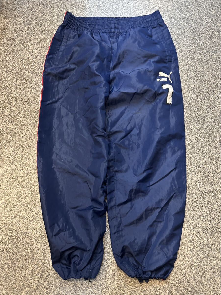 PUMA プーマ M 日本製 ウィンドブレーカー スポーツウェア ジャージ ボトムス ロゴ刺繍 ネイビー 裏地メッシュ オールド 古着 ユーズド