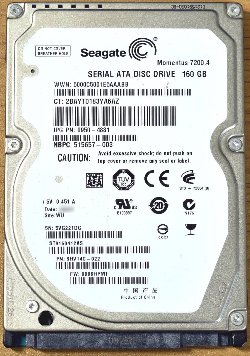 Seagate ST9160412AS [320GB 2.5インチ 9.5mm SATA HDD 2010年製 使用時間 1269H (Cristal DiscInfo 正常) (管:KH416