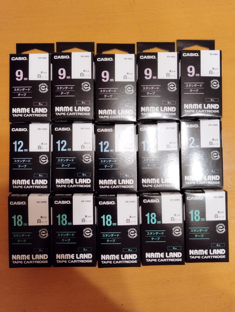 CASIOネームランドテープ15個 未使用品 XR-9WE・XR-12WE・XR-18WE 各5個 白テープ黒文字 ゆうパック60サイズ発送1