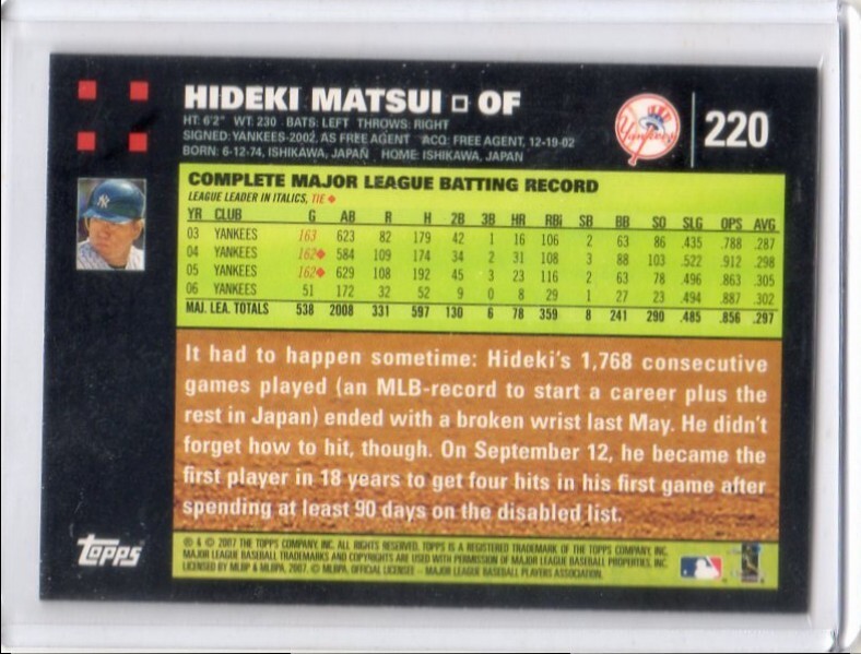 ●松井秀喜 カード Vol.19 2007TOPPS #220 ニューヨーク・ヤンキース