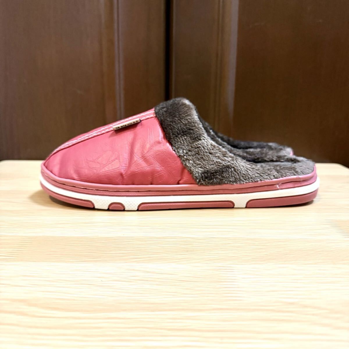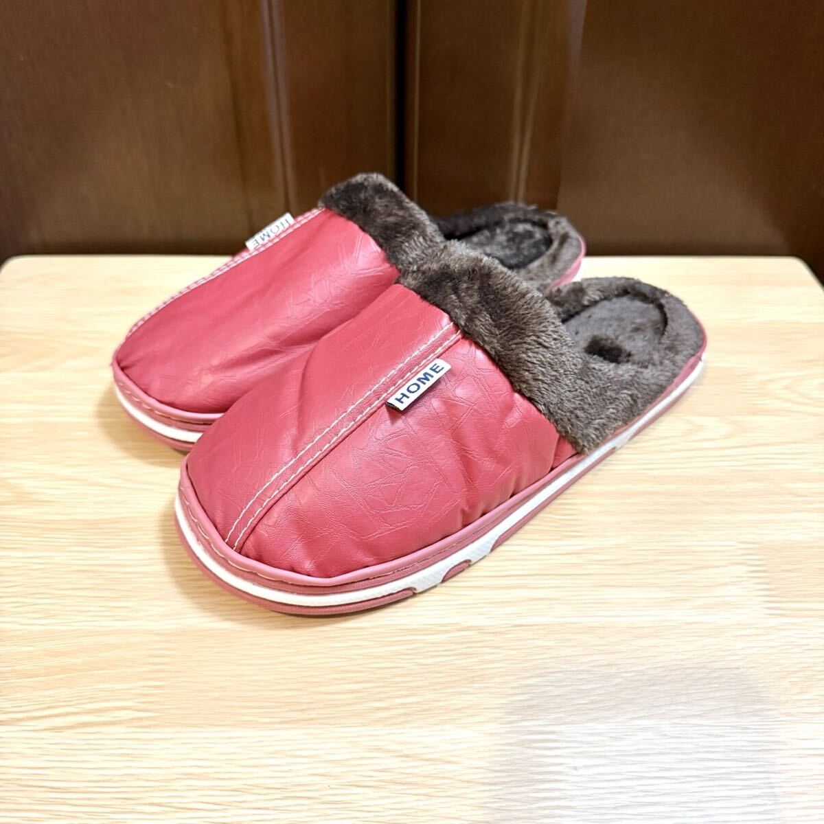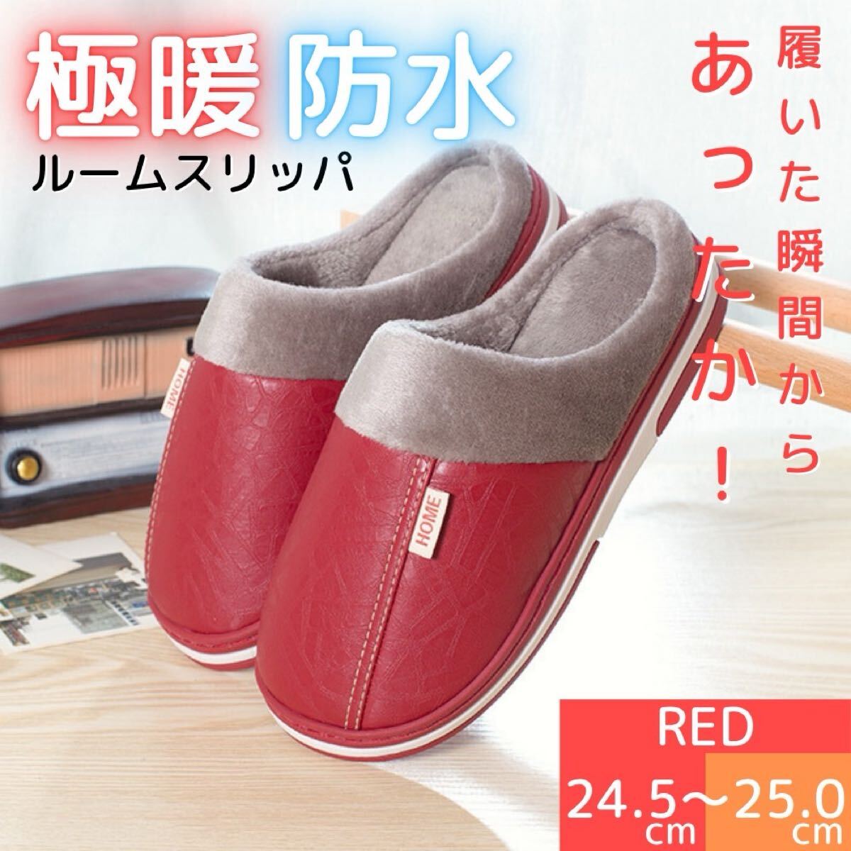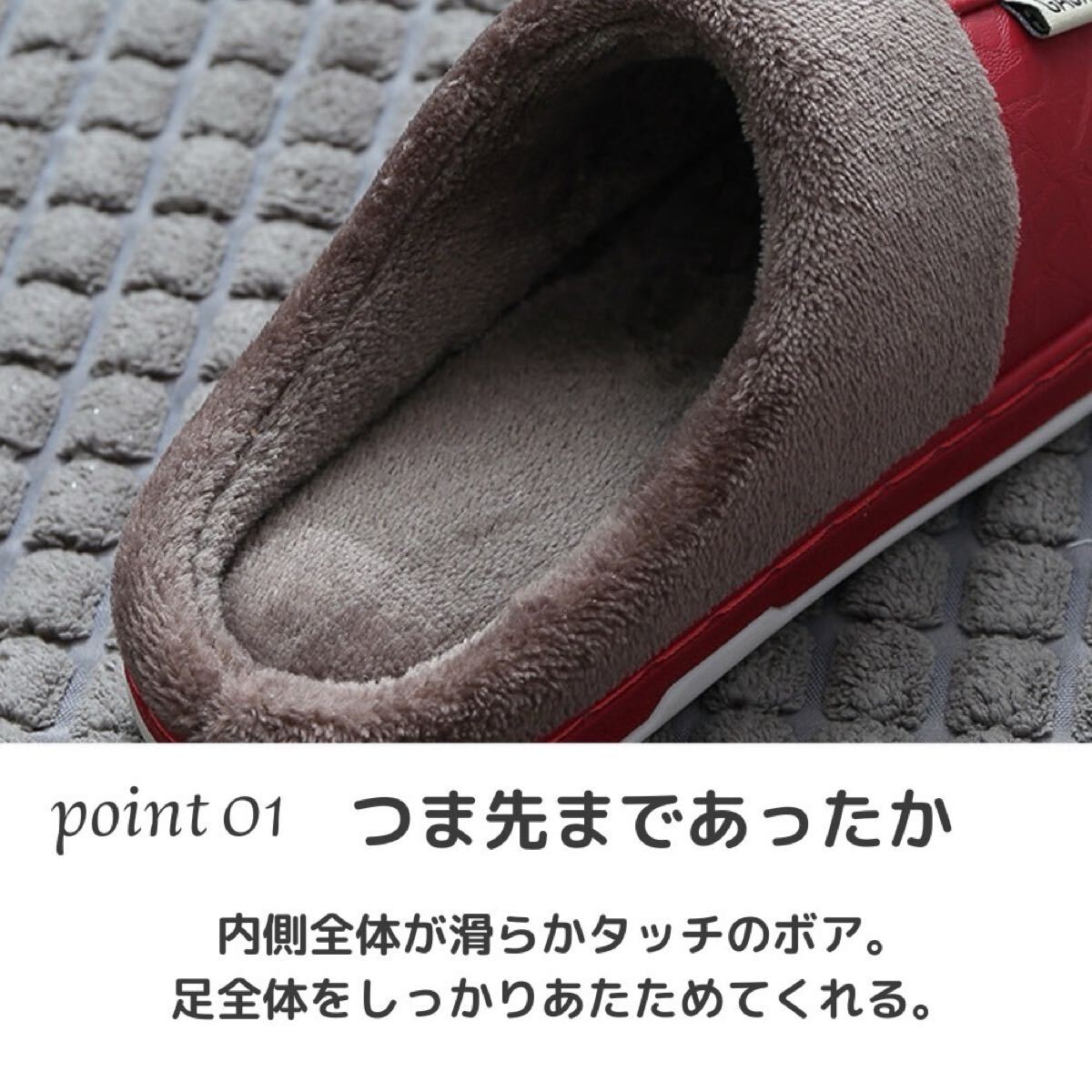 ルームスリッパ ルームサンダル 裏ボア 防水 レザー調 ふわふわ ボア あったか レッド 24.5〜25.0