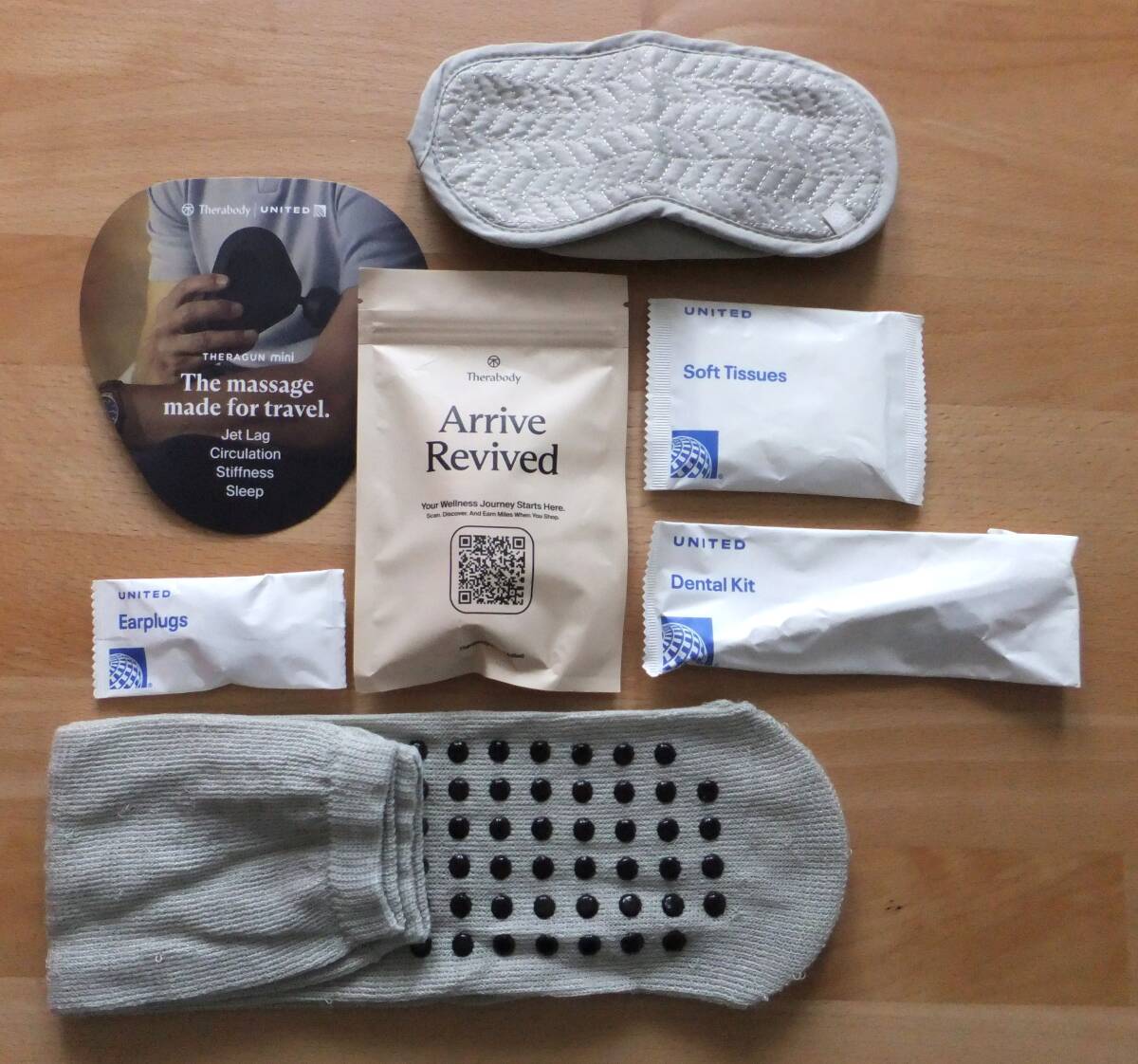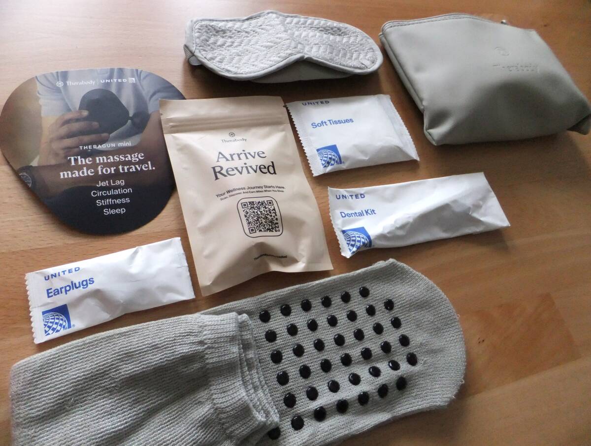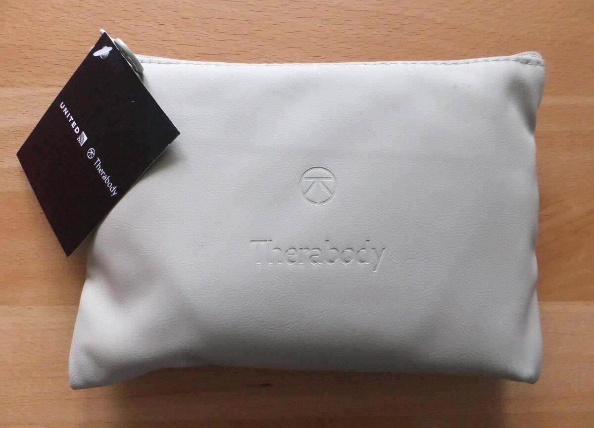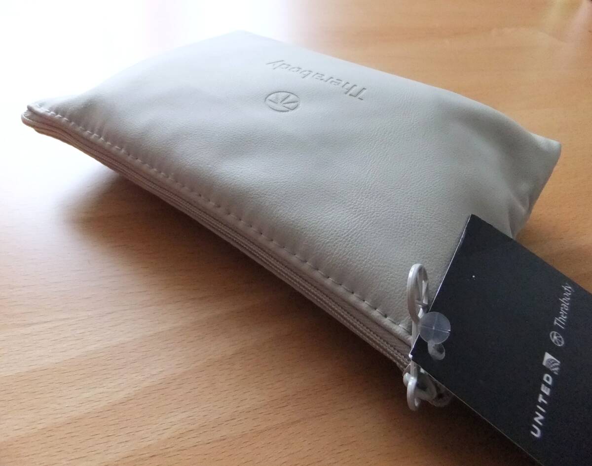 未使用 Therabody ユナイテッド航空 UNITED AIRLINES セラボディのポーチ入りアメニティセット ベージュポーチ アイマスク 耳栓 靴下等