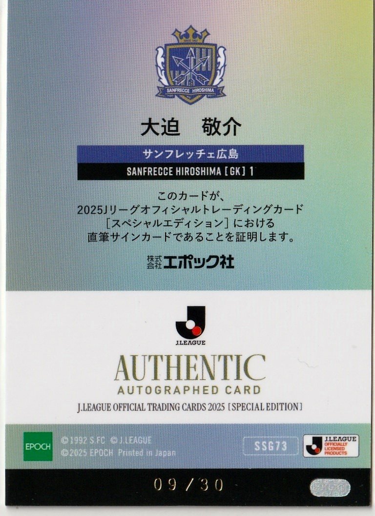 30枚限定【 SSG73 大迫 敬介 広島】9/30 SE直筆サインカード EPOCH 2025 Jリーグ オフィシャルトレカ スペシャルエディション SE