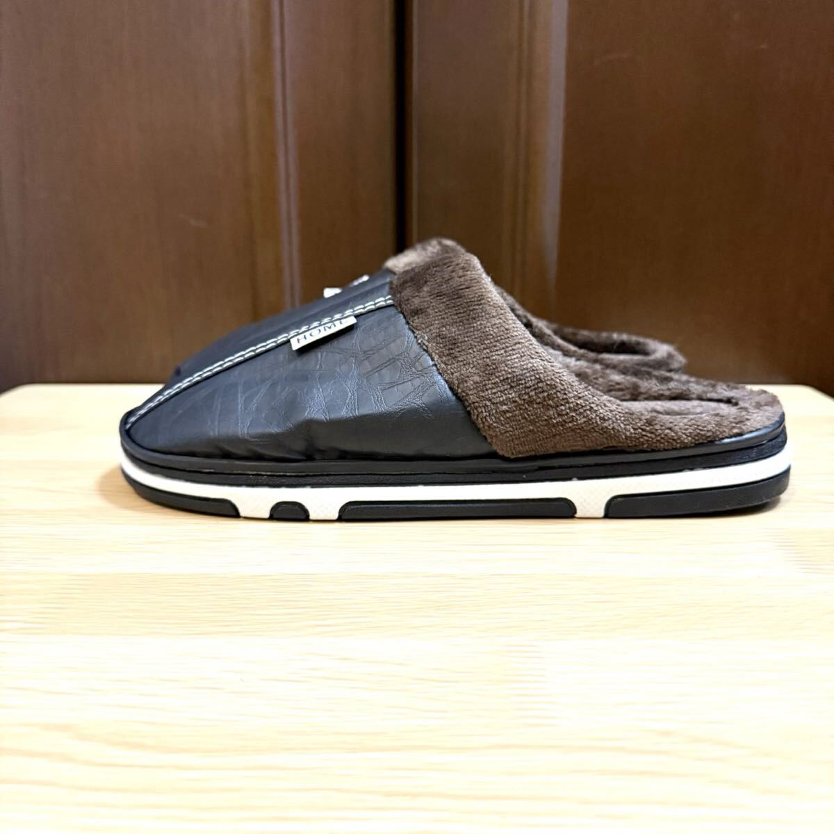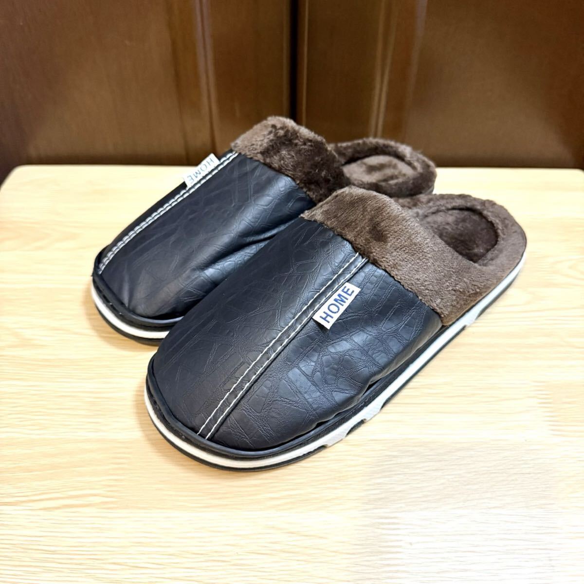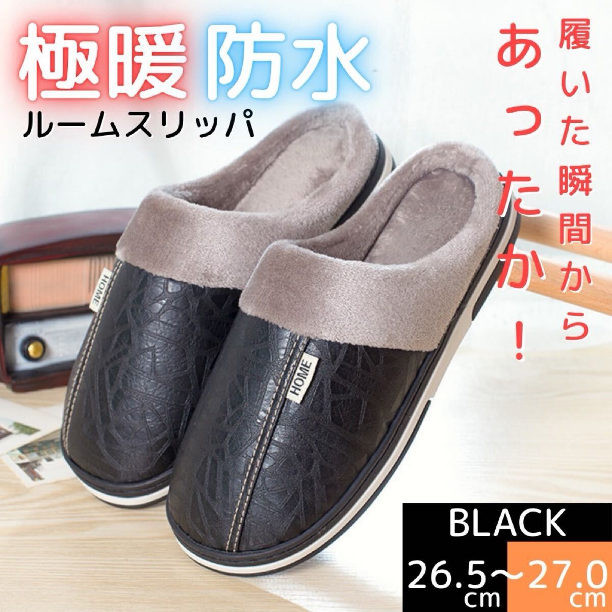 ルームスリッパ ルームサンダル 裏ボア 防水 レザー調 ふわふわ ボア あったか ブラック 26.5〜27.0