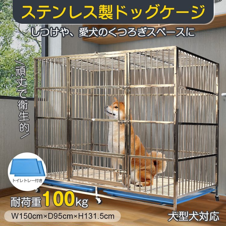 送料無料 犬用ケージ 大型犬 ケージ 犬小屋 頑丈 ゲージ 犬用ケージ 屋根付き キャスター付き ステンレス トレー 脱走防止 pt088h-150-sil