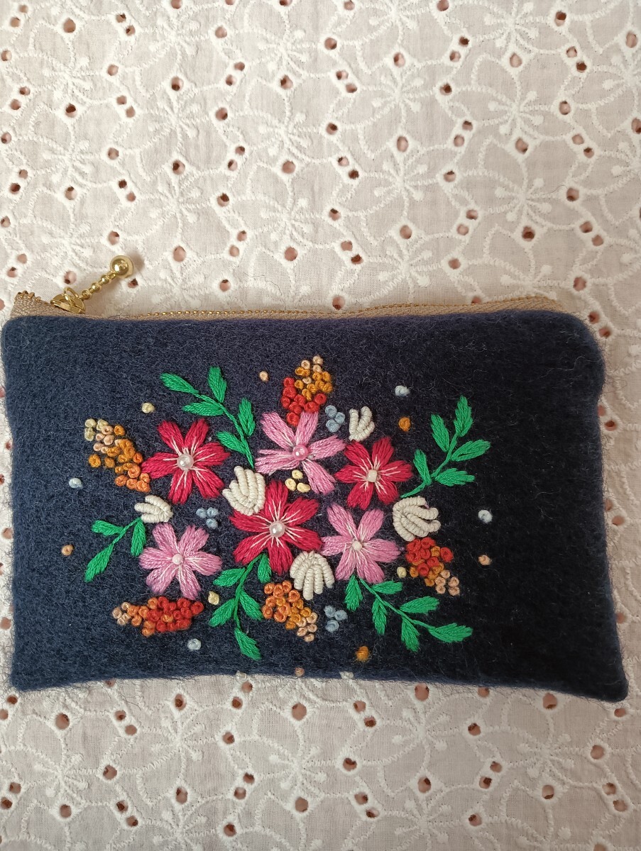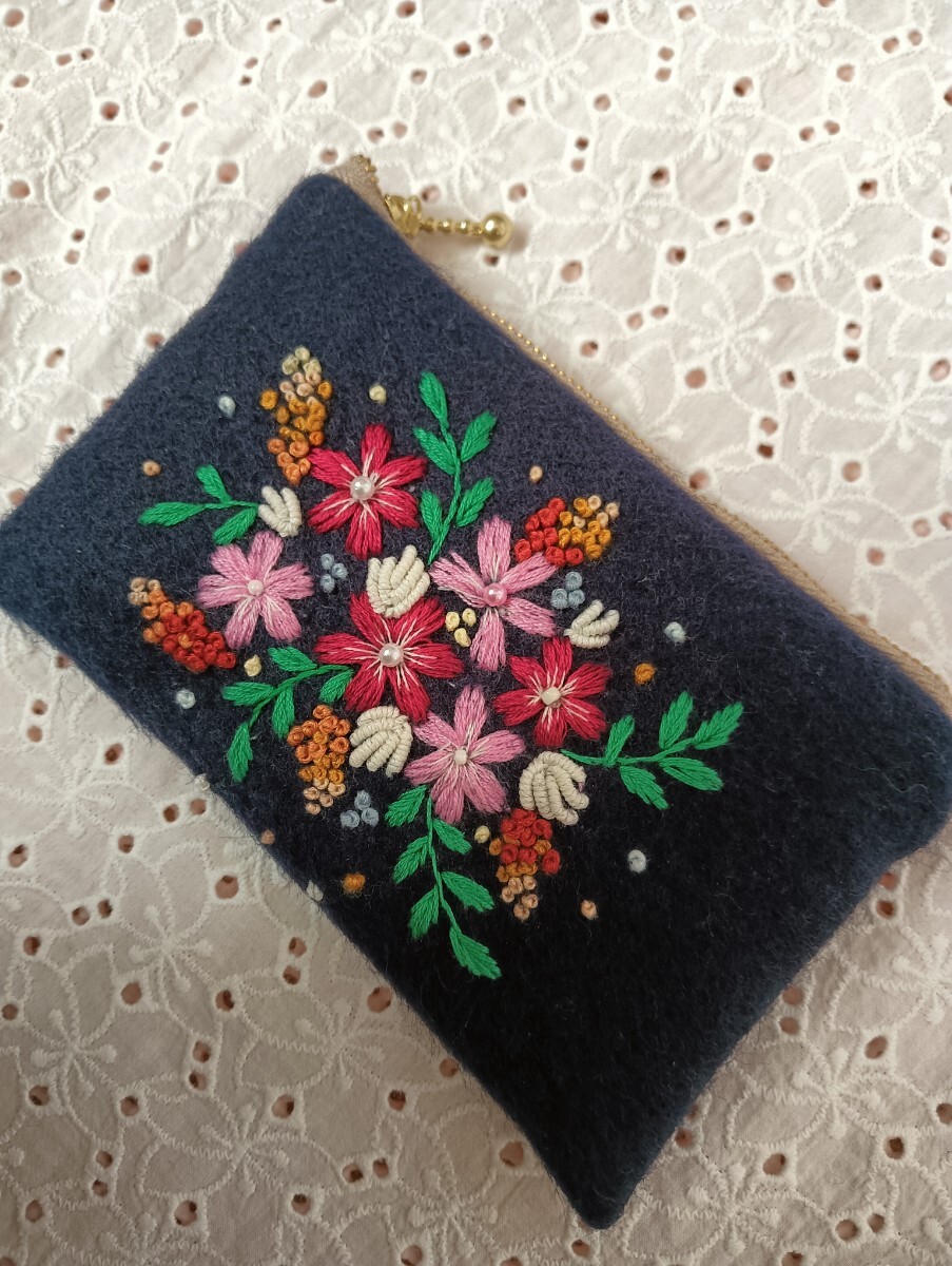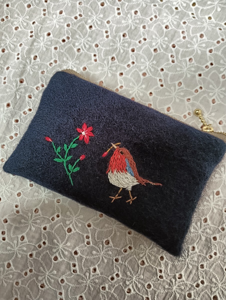 ハンドメイド*手刺繍*ポーチ*小鳥と草花*温かウール*シャギー地*濃紺ネイビー*ファスナー開閉*ビーズ飾り