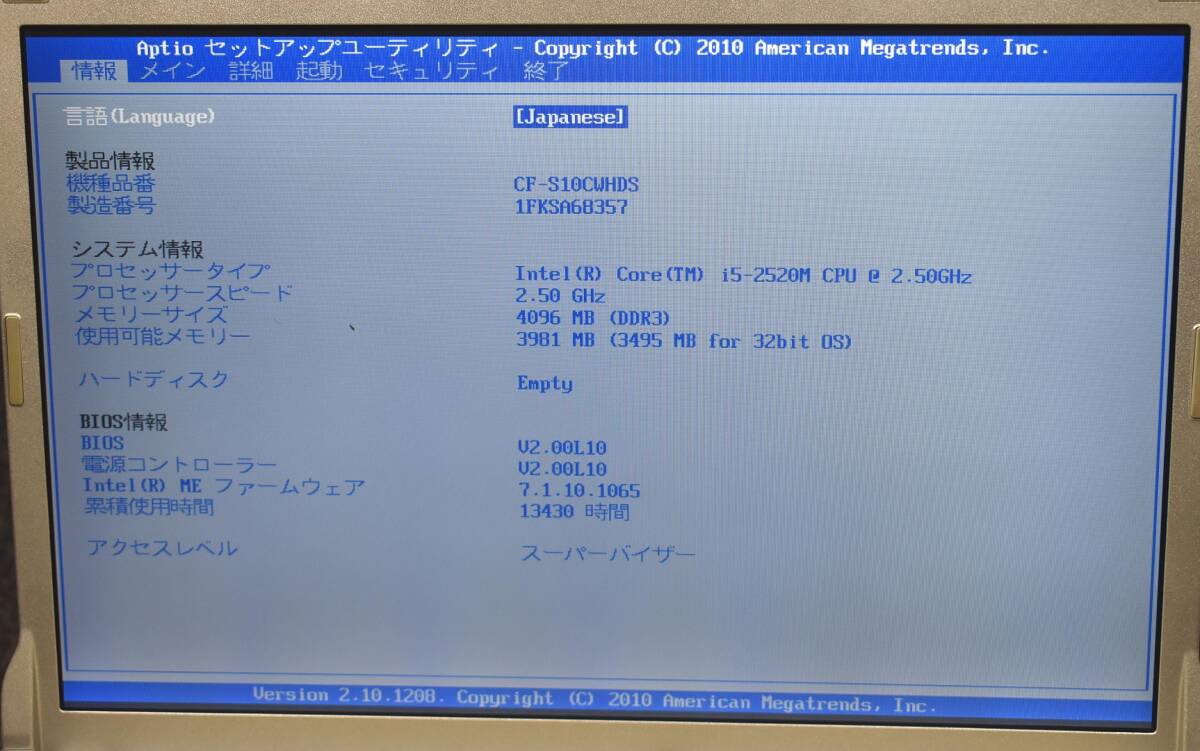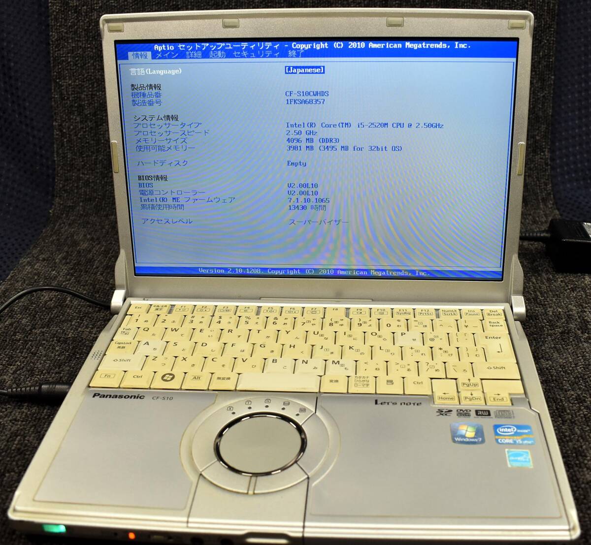 起動確認済み(ジャンク扱い) Panasonic CF-N10CWHDS CPU:i5-2520M RAM:4G HDD:無し 本体のみ (管:KP1089