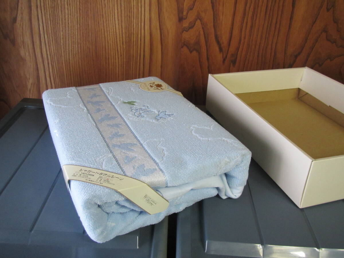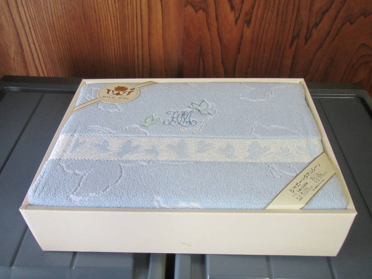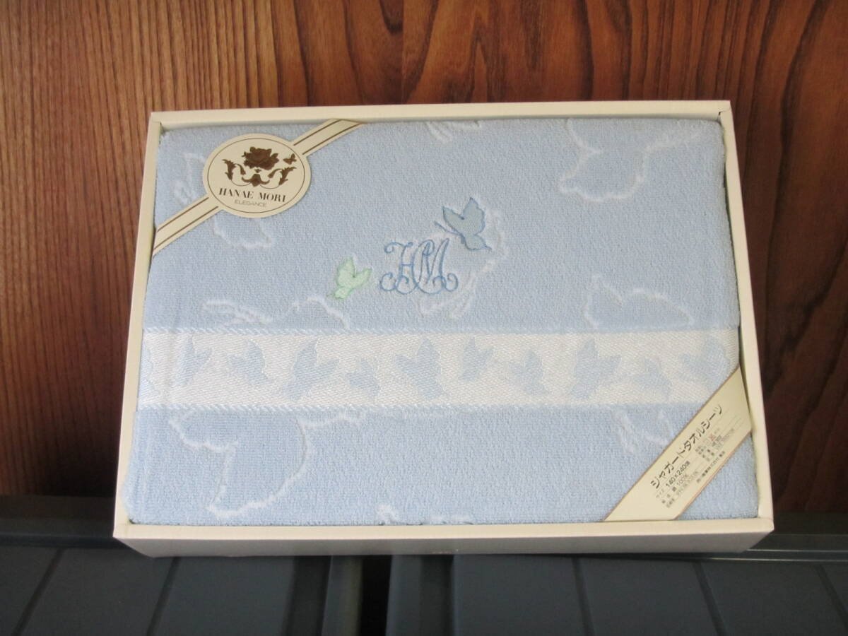 未展開 未使用『MORI HANAE 森 ハナエ』 ジャガード タオルシーツ (ブルー柄もの) 140×240cm 日本製 綿100% 専用箱付き 送料込み