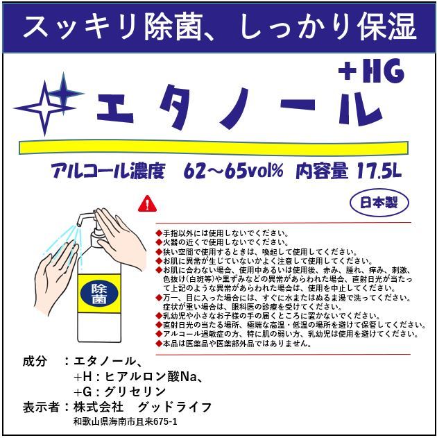 ☆数量限定!(しっかり潤い・しっかり保湿)エタノール+HG 17.5L 1缶!☆