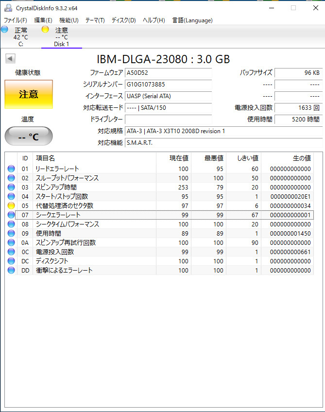 珍品 IBM DLGA-23080 [ディスク容量 3G] 2.5インチ 44pin IDE パラレルATA ハードディスク 15mm厚 使用時間 5200H (管:HAN0