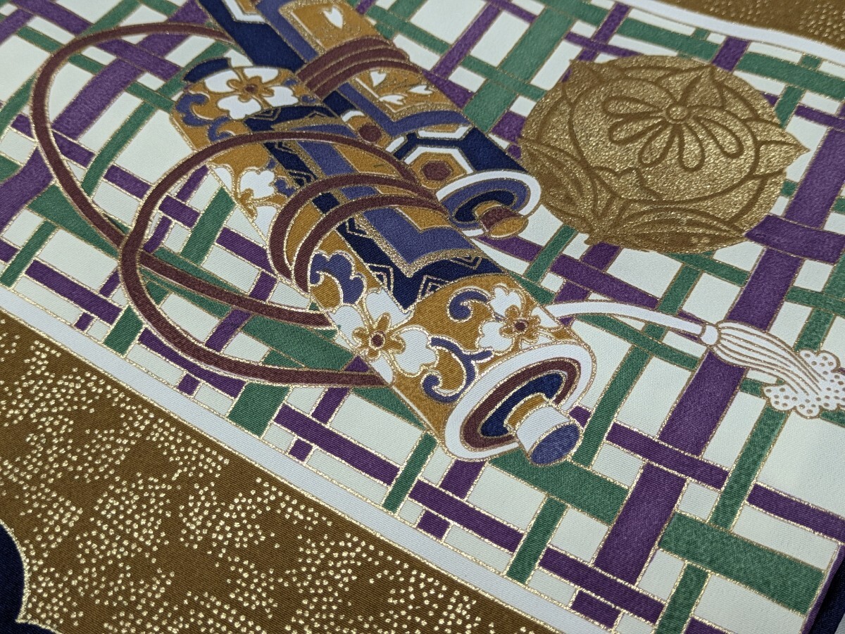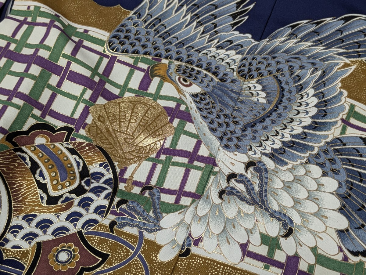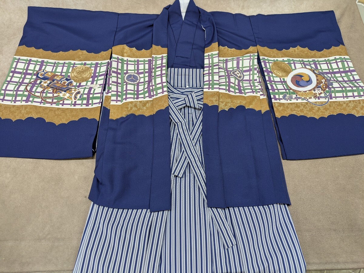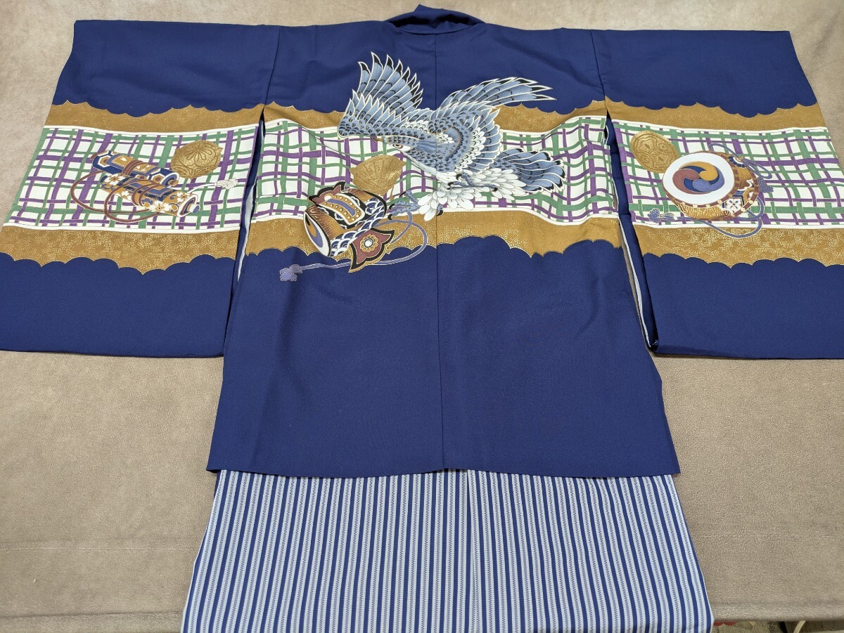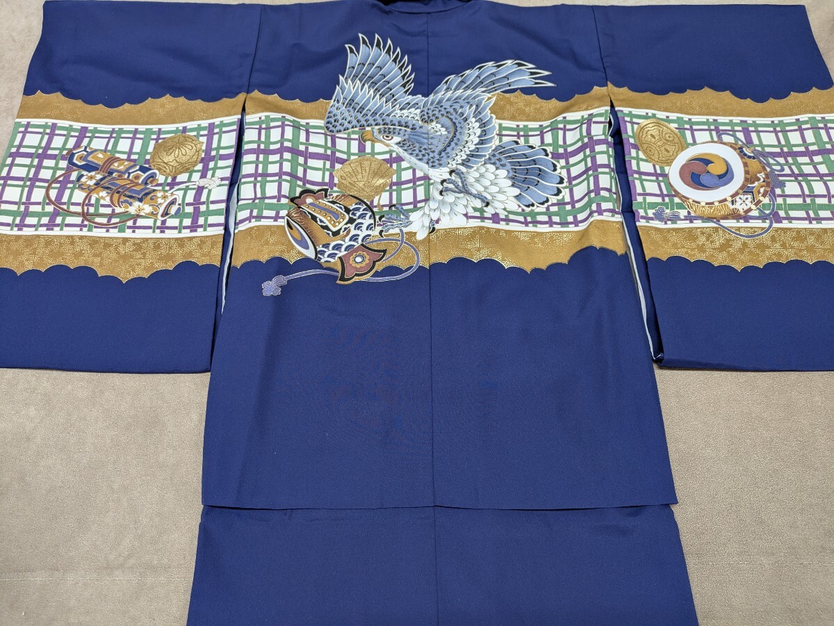 七五三 5歳児くらい 男の子 男児 着物 羽織 袴 まとめ売り 紺色 和装 和服 和柄 レトロ柄 鷹 鷲 打出の小槌 リメイク 素材 材料 生地