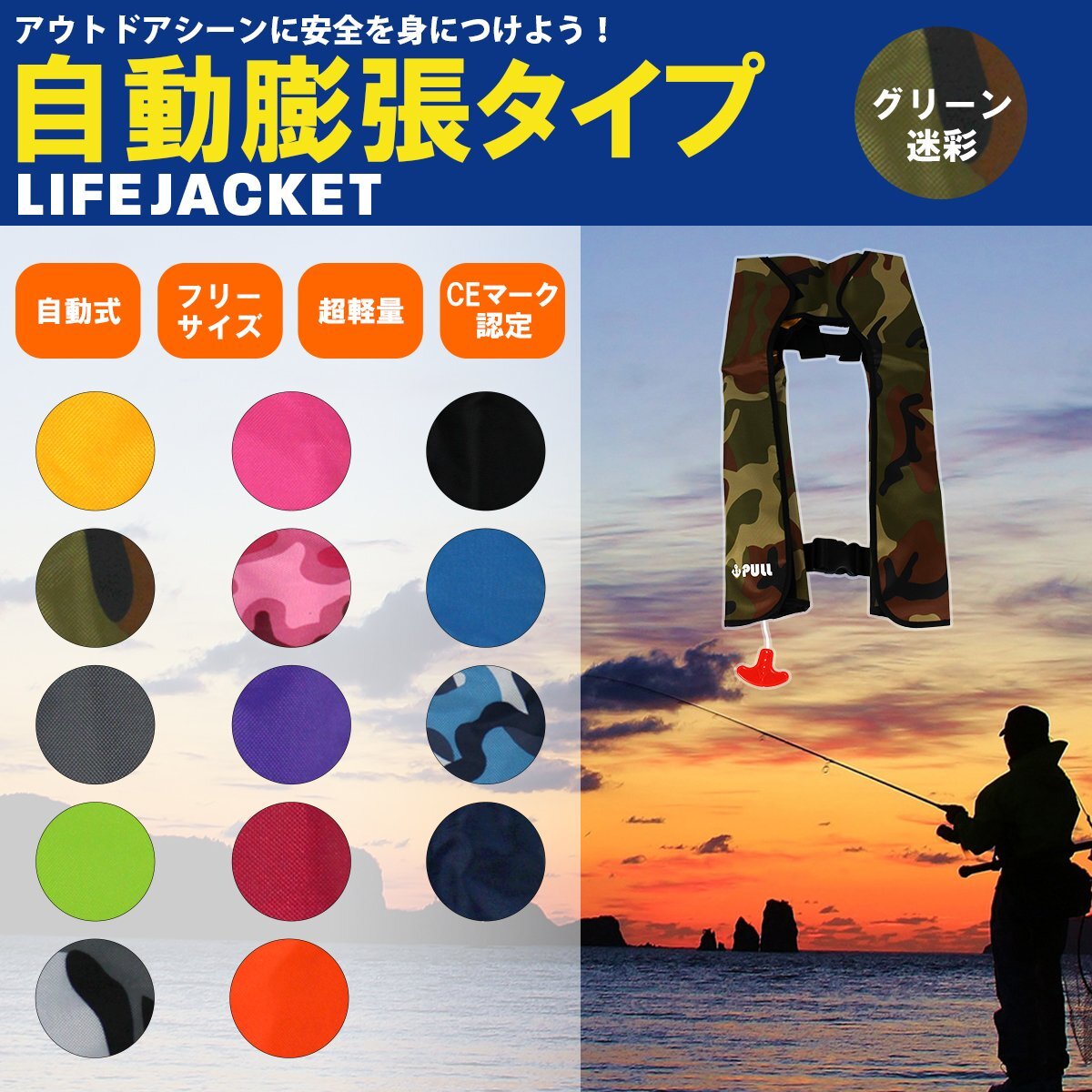 大人気!オリジナルデザイン! ライフジャケット 自動膨張式 肩掛け ベストタイプ 迷彩グリーン ※男女兼用! フリーサイズ 釣り 船 ボート