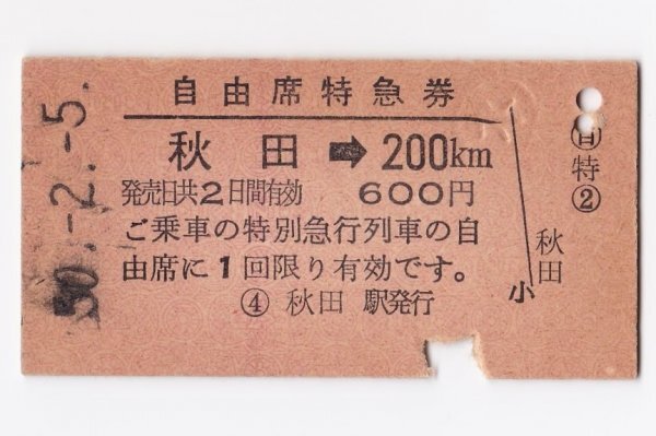 ●国鉄●【 秋田→200kmまで 自由席特急券 600円(細矢印) 】A型券 昭和50年 奥羽本線 秋田駅発行【03138】