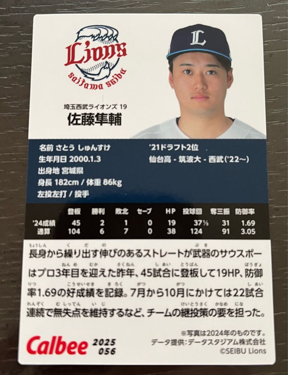 同梱可能☆カルビー プロ野球チップス☆2025年 埼玉西武ライオンズ 佐藤 隼輔投手ノーマルカード