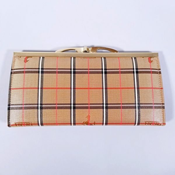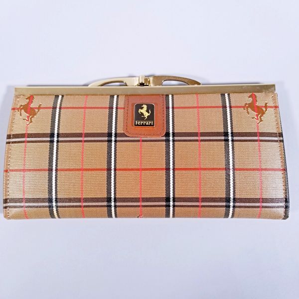 【最終値下げ】Ferrari フェラーリ がま口 長財布 ベージュ チェック柄 札入れ 跳ね馬 男女兼用 サイフ 財布 がま口長財布