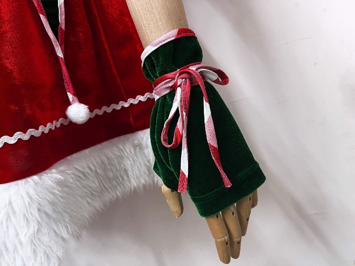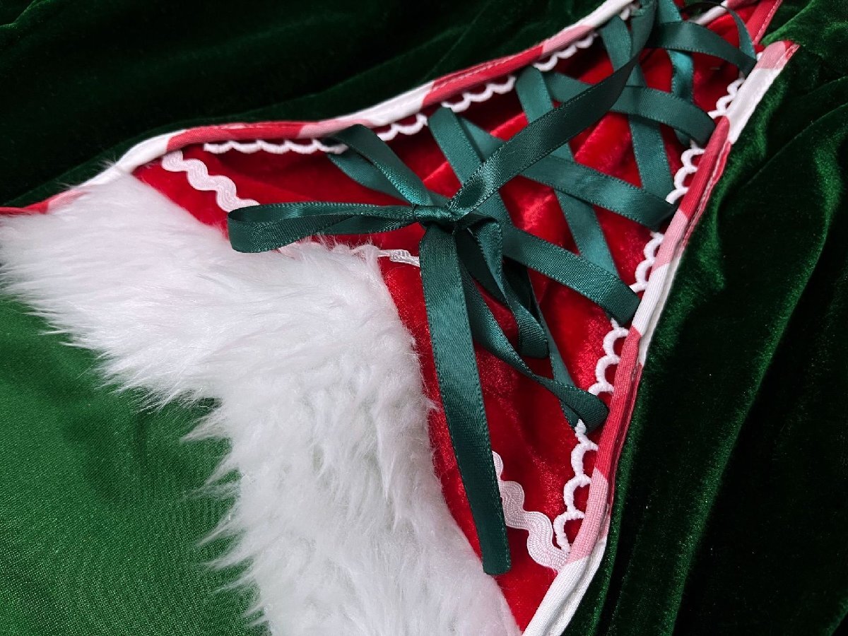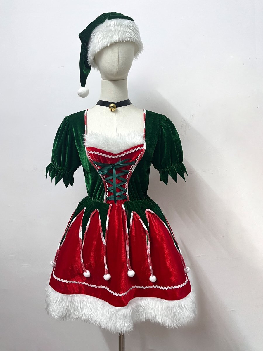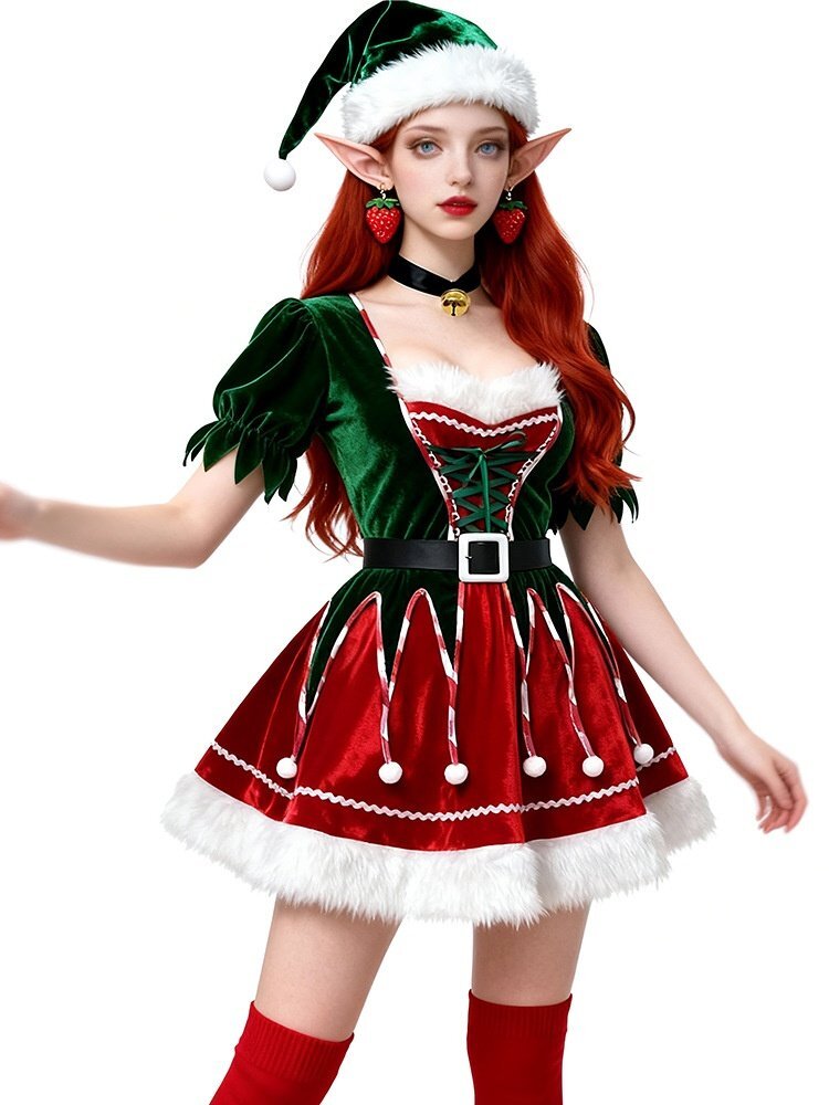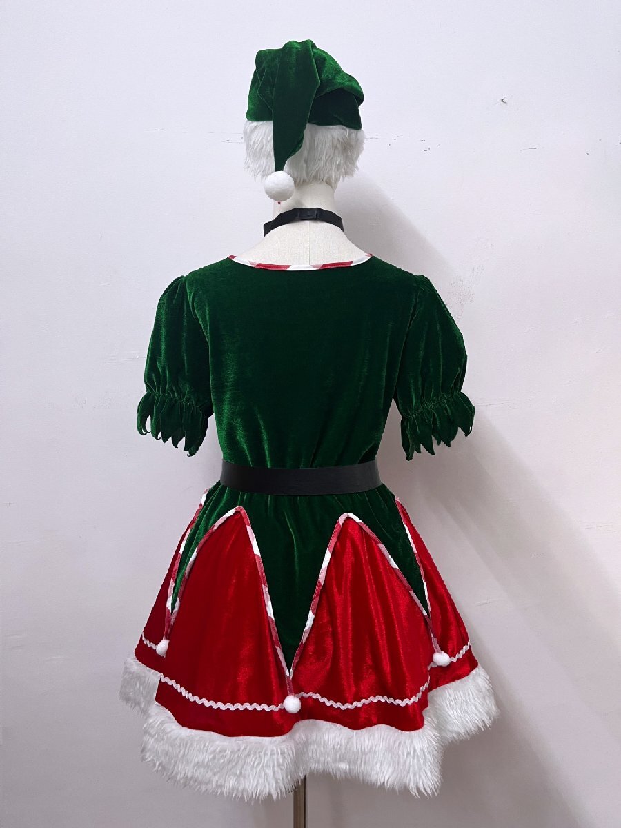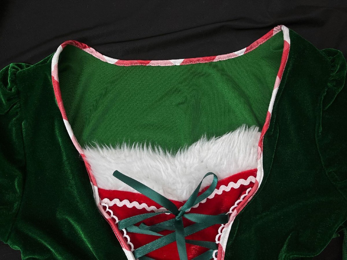 XLサイズ クリスマスエルフ コスチューム, グリーン&レッド, ポリエステル100%, セクシーパーティードレス, 帽子・ベルト・手袋・ネックレ