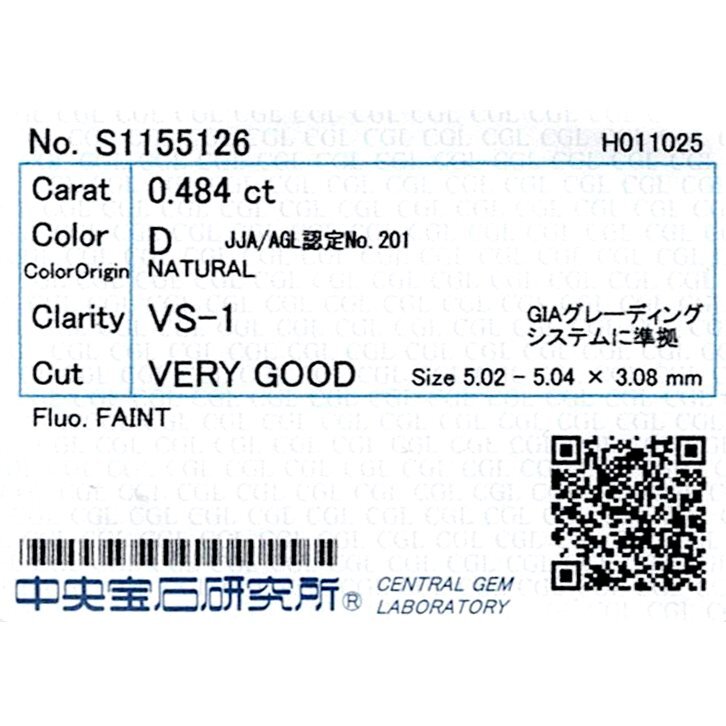 S3777【BSJD】天然ダイヤモンドルース 0.484ct D/VS-1/VERY GOOD ラウンドブリリアントカット 中央宝石研究所 ソーティング付き