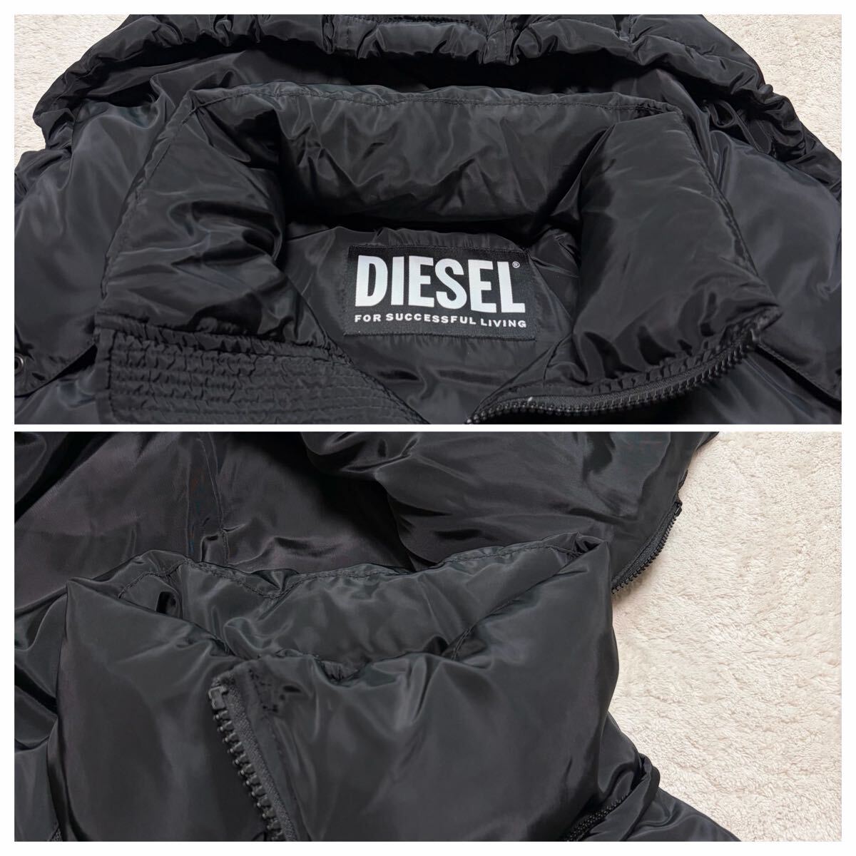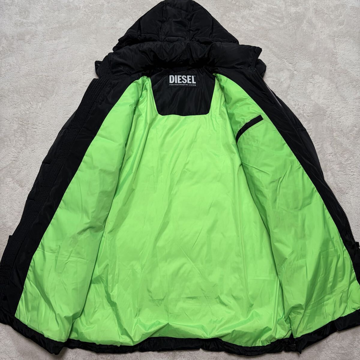 未使用級!/近年モデル/XL~XXL相当●ディーゼル DIESEL ロングダウンジャケット ブラック ジップ 中綿 ロゴ 裏地蛍光 アウター フード着脱