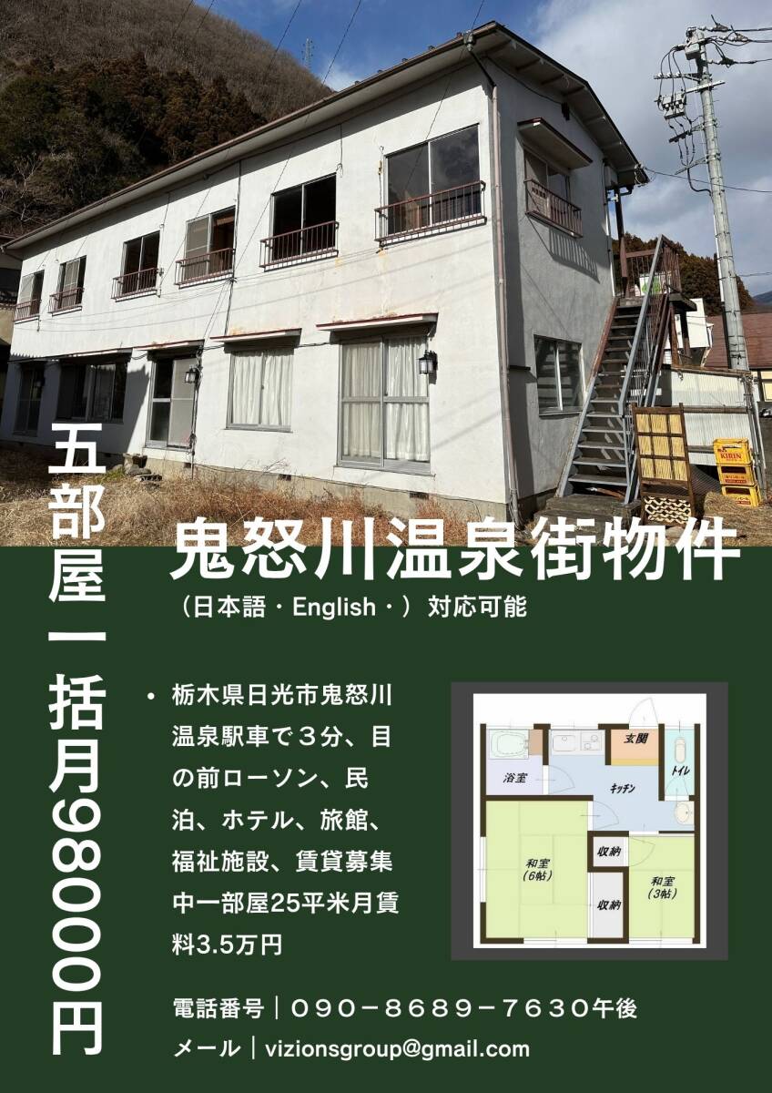 栃木県日光市鬼怒川温泉駅車で3分、5部屋リノベーション工事中、目の前ローソン、民泊、ホテル、旅館、福祉施設など最適