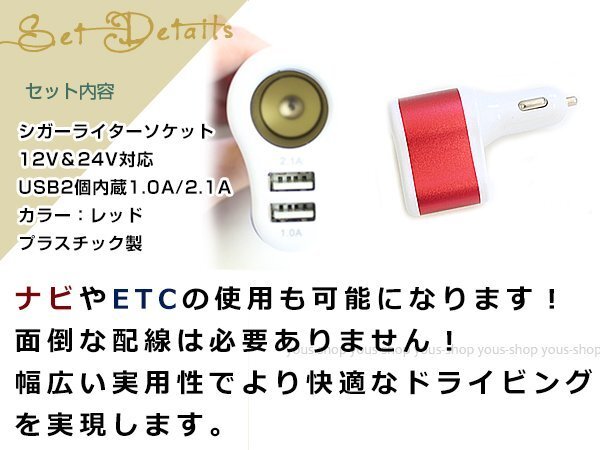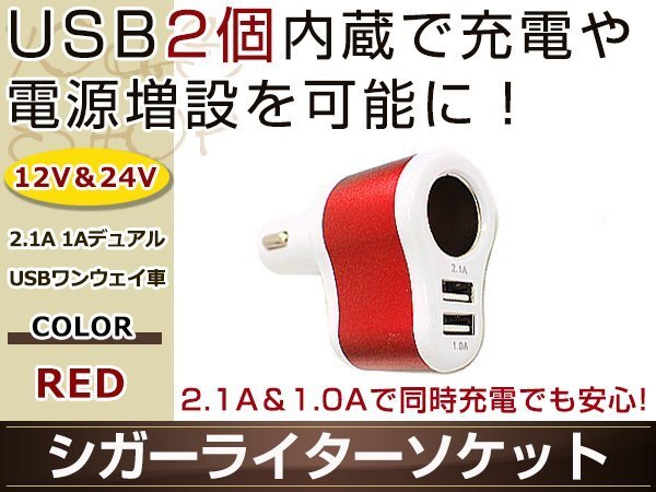 シガーライターソケット レッド 2.1A 1A デュアルUSBワンウェイ車 12V/24V対応 USB2個内蔵 2台同時に充電可能 スマホ タブレットの充電に