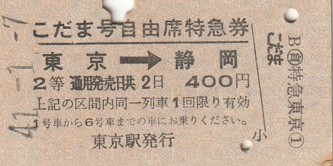 V104.こだま号自由席特急券 東京⇒静岡 41.1.7【6330】