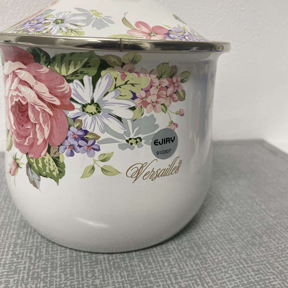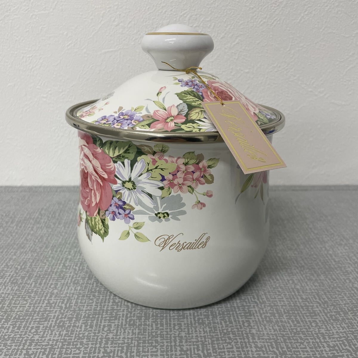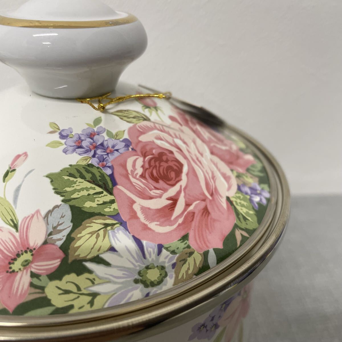 ホーロー鍋 エジリーヴェルサイユ 花柄 陶器キャニスター 金縁付き 蓋付き 高さ16.5cm 直径14cm