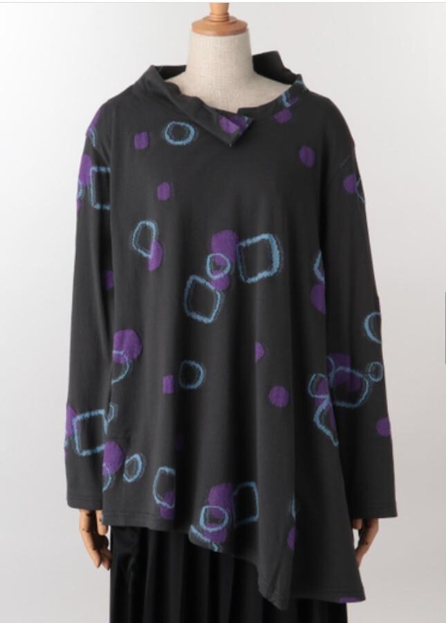 2-1 センソユニコ ◎ 慈雨 プルオーバー チュニック カットソー アシンメトリー チャコールグレー 丸と四角柄 40 ◎