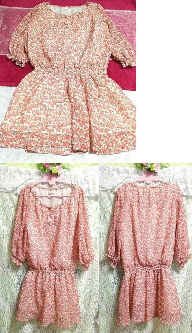 赤花柄長袖ネグリジェチュニックワンピース Red flower pattern negligee long sleeve tunic dress