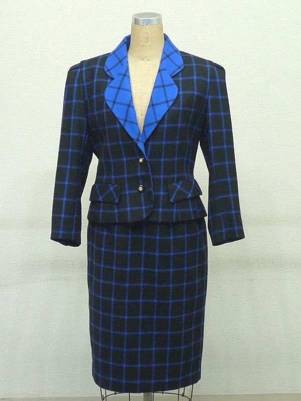 昭和レトロモダンなチェックがお洒落なヴィンテージスーツ 11号 毛/ウール100% ツーピース タイトスカート ジャケット 秋冬 レディース 婦人服