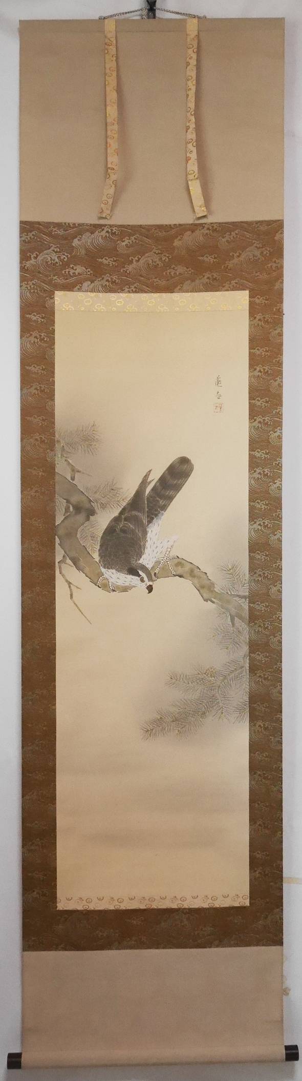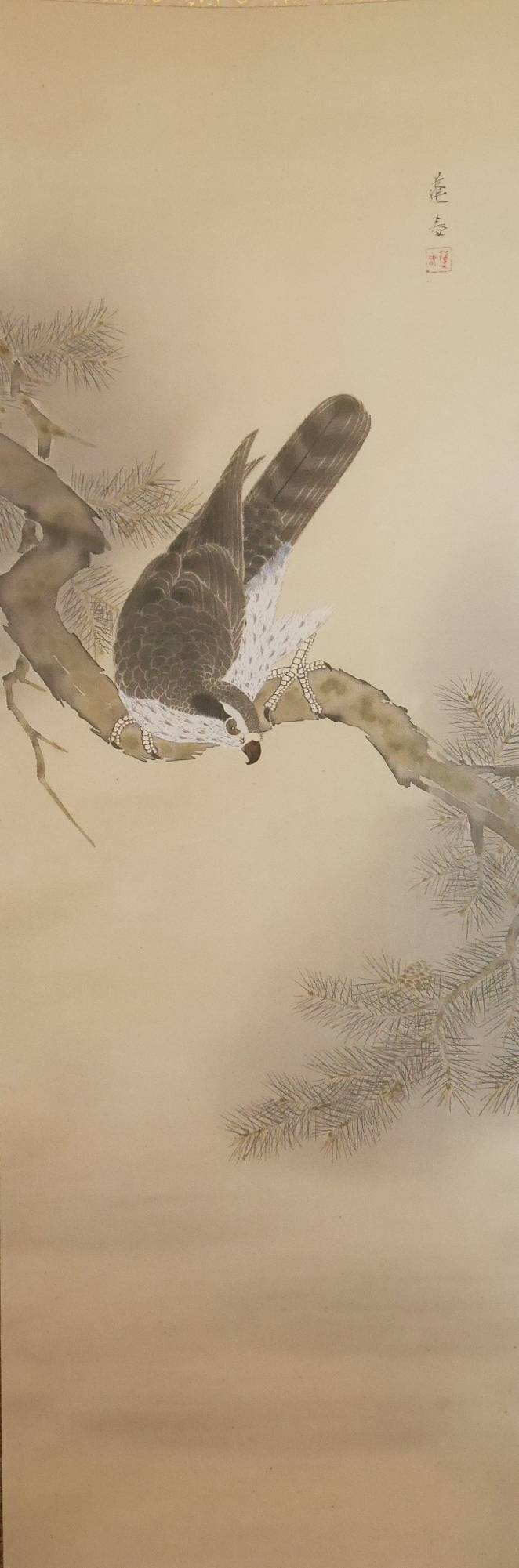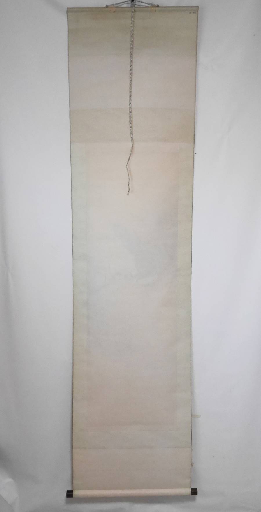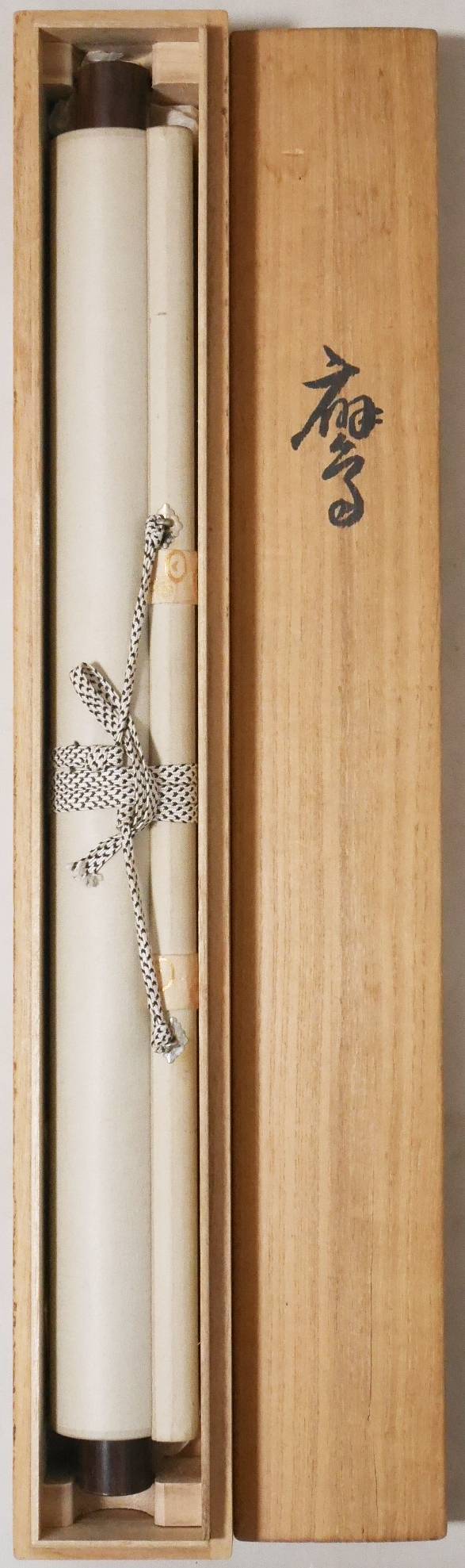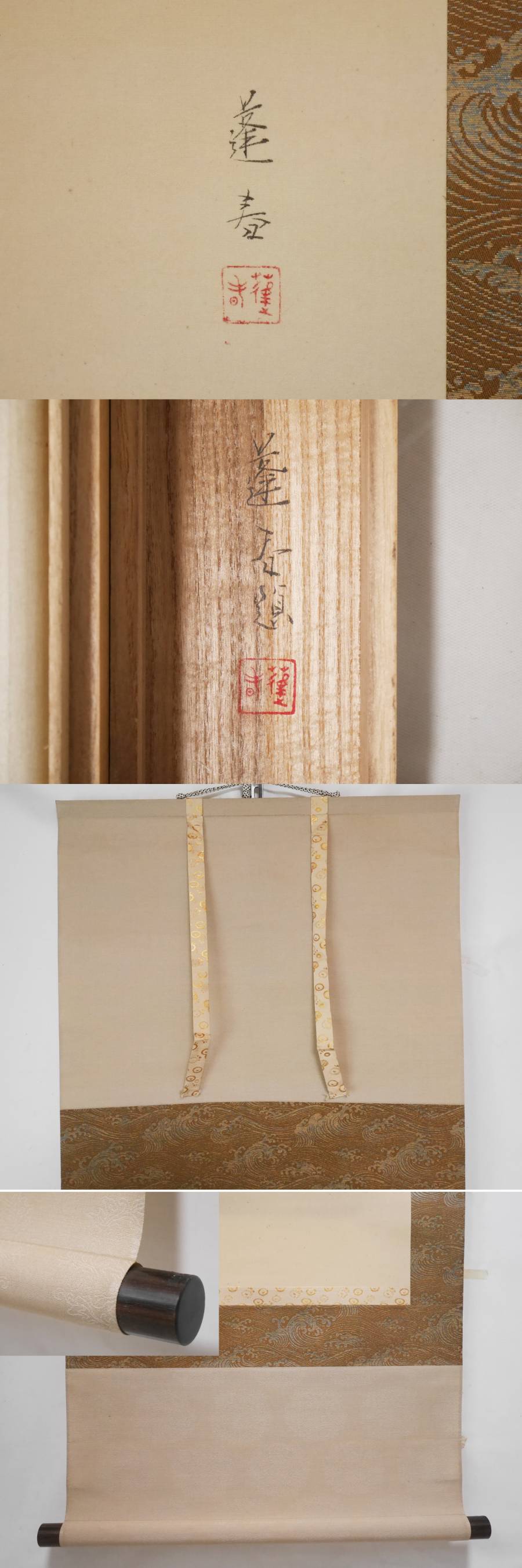 【商品詳細・仕様】 表装寸:約47.5㎝×丈約188㎝㎝ 軸寸(軸先含む):幅約52.7㎝ 画 寸:約35㎝×105.5㎝ (手測りのため僅かな誤差ございます。予めご了承くださいませ。) 軸先:木製 本紙絹本・肉筆 共箱入(桐箱)