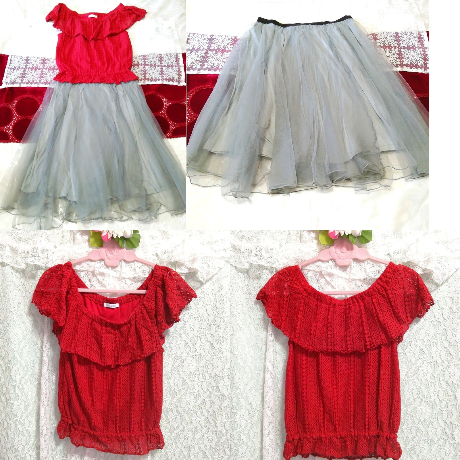 赤レースチュニック ネグリジェ グレーチュールスカート 2P Red lace tunic negligee gray tulle skirt