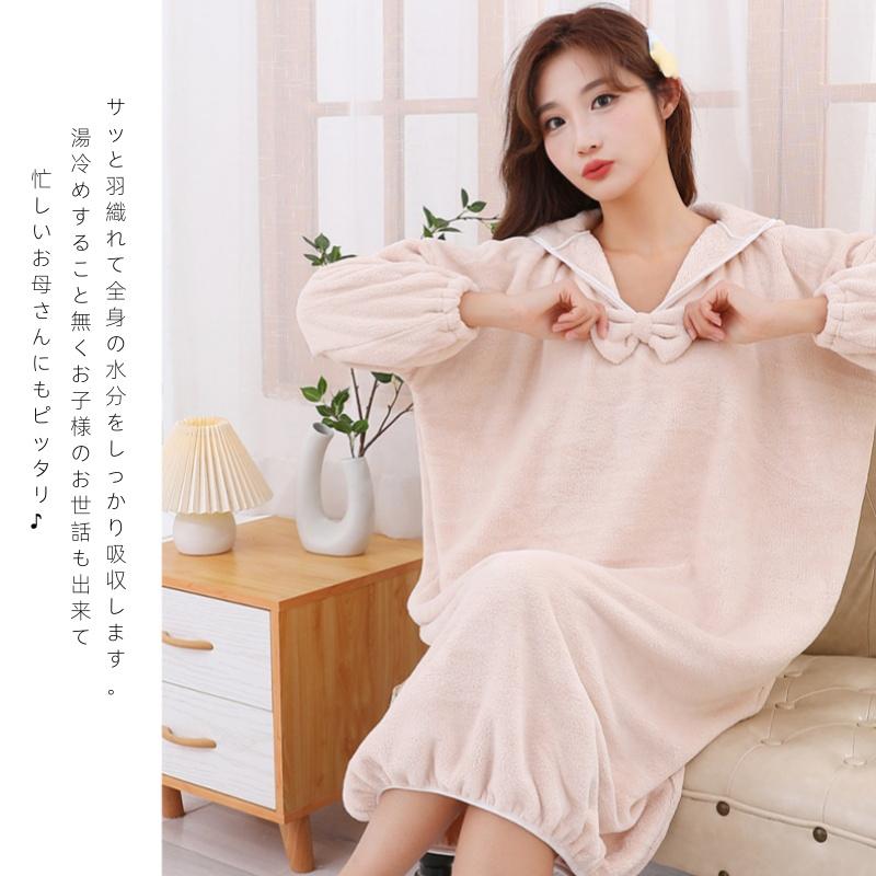 バスローブ ポンチョ ワンピース ママ 子育て レディース 長袖 フード付き リボン 女子 ジュニア お風呂上り 吸水 速乾 時短 洗える タオル地 ワンピース