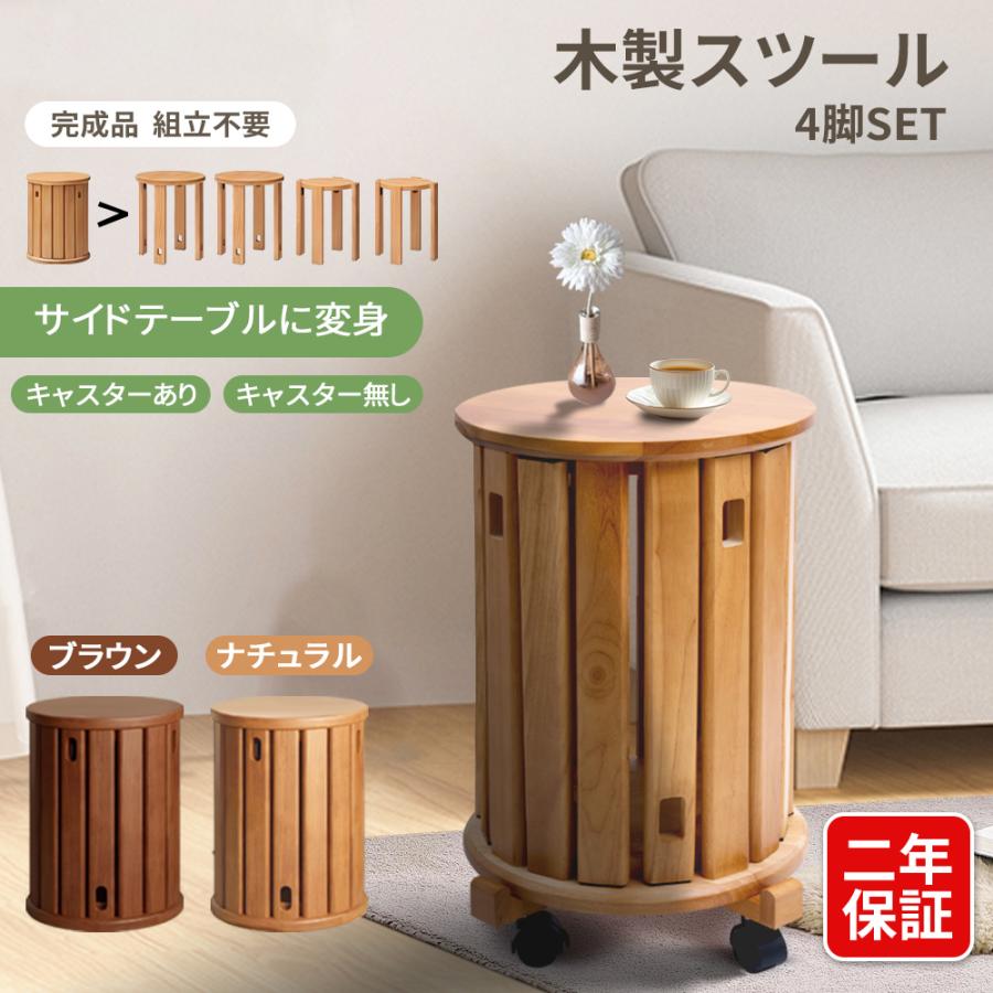 スツール 木製 4脚セット サイドテーブル キッチンスツール 食卓椅子 完成品 ソファデーブル 収納 円形 重ねる 椅子 天然木 スタンキングスツールセット 2年保証