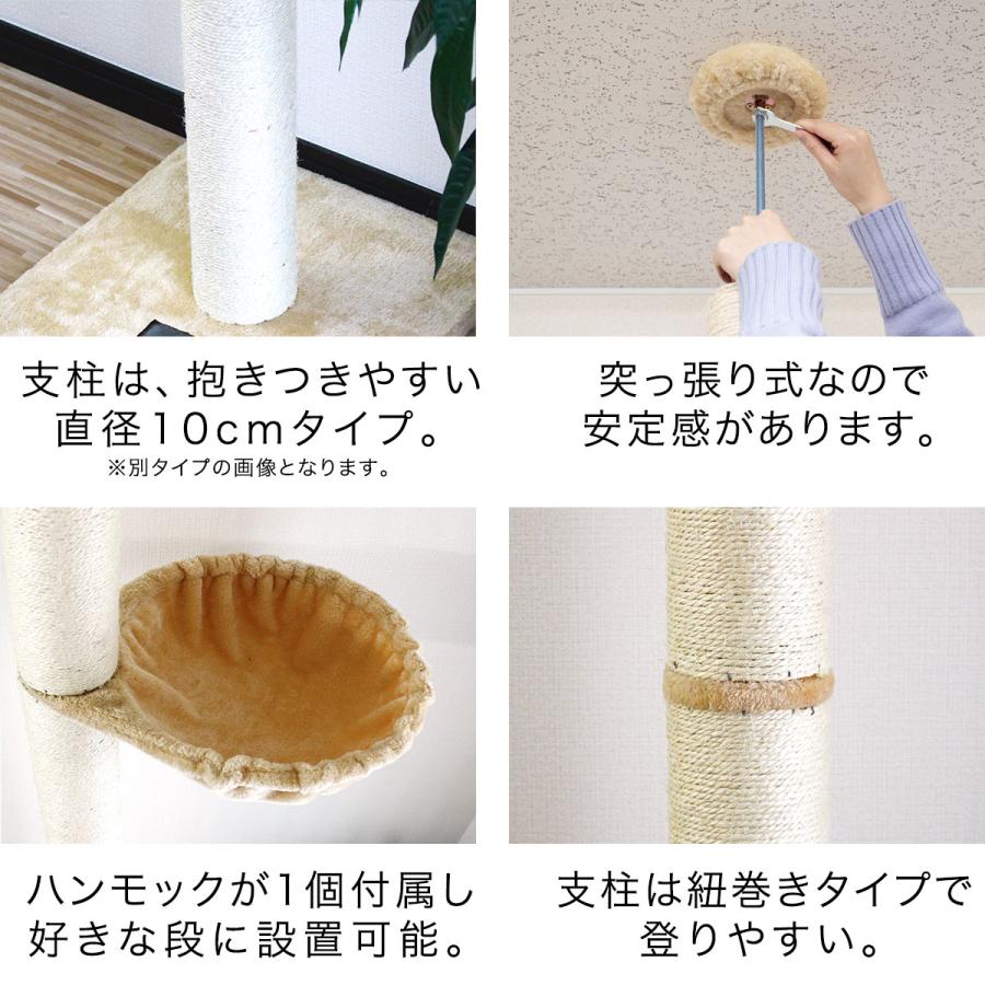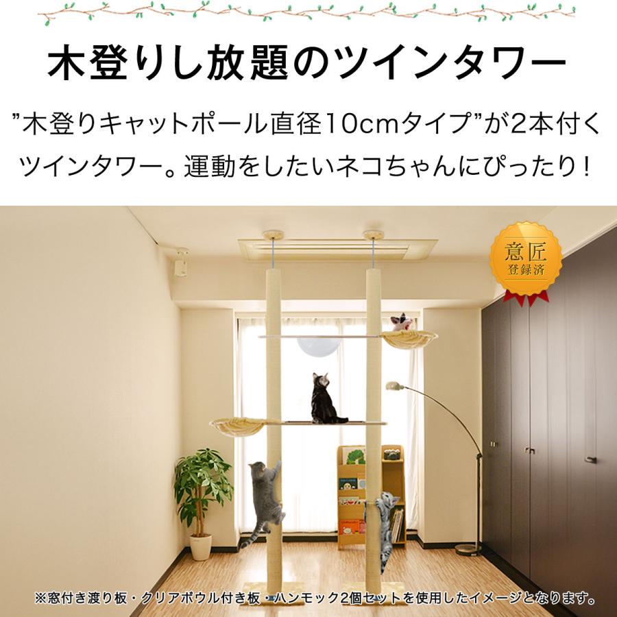 キャットツリー タワー 麻ひも 突っ張り ツイン 渡り板付き 全高240~255cm 直径10cm シニア 運動不足 木登り キャットポール きのぼり 木登り 1年保証 送料無料